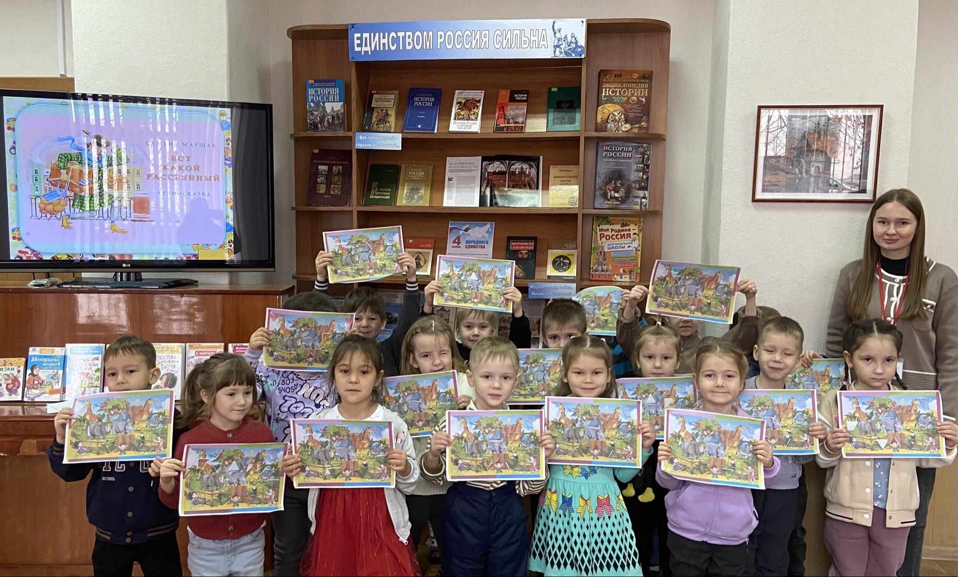 Открыв сундучок, дети погрузились в мир поэзии и сказок замечательного писателя. В сундучке были собраны книги с яркими иллюстрациями, игровые материалы и задания, связанные с произведениями Маршака. Сначала библиотекарь Юлия Белкина познакомила дошкольников с известными стихотворениями «Багаж», «Детки в клетке», «Где обедал воробей» и др., а затем прочитала «Сказку о глупом мышонке» и предложила детям обсудить, какие животные встречаются в сказочной истории и дать им краткую характеристику. После этого малыши могли выбрать карточки с изображениями героев «Сказки о глупом мышонке» и составить свою собственную историю. В конце мероприятия все вместе собрали мозаику - аппликацию «В зоопарке» и посмотрели мультфильм «Вот какой рассеянный».