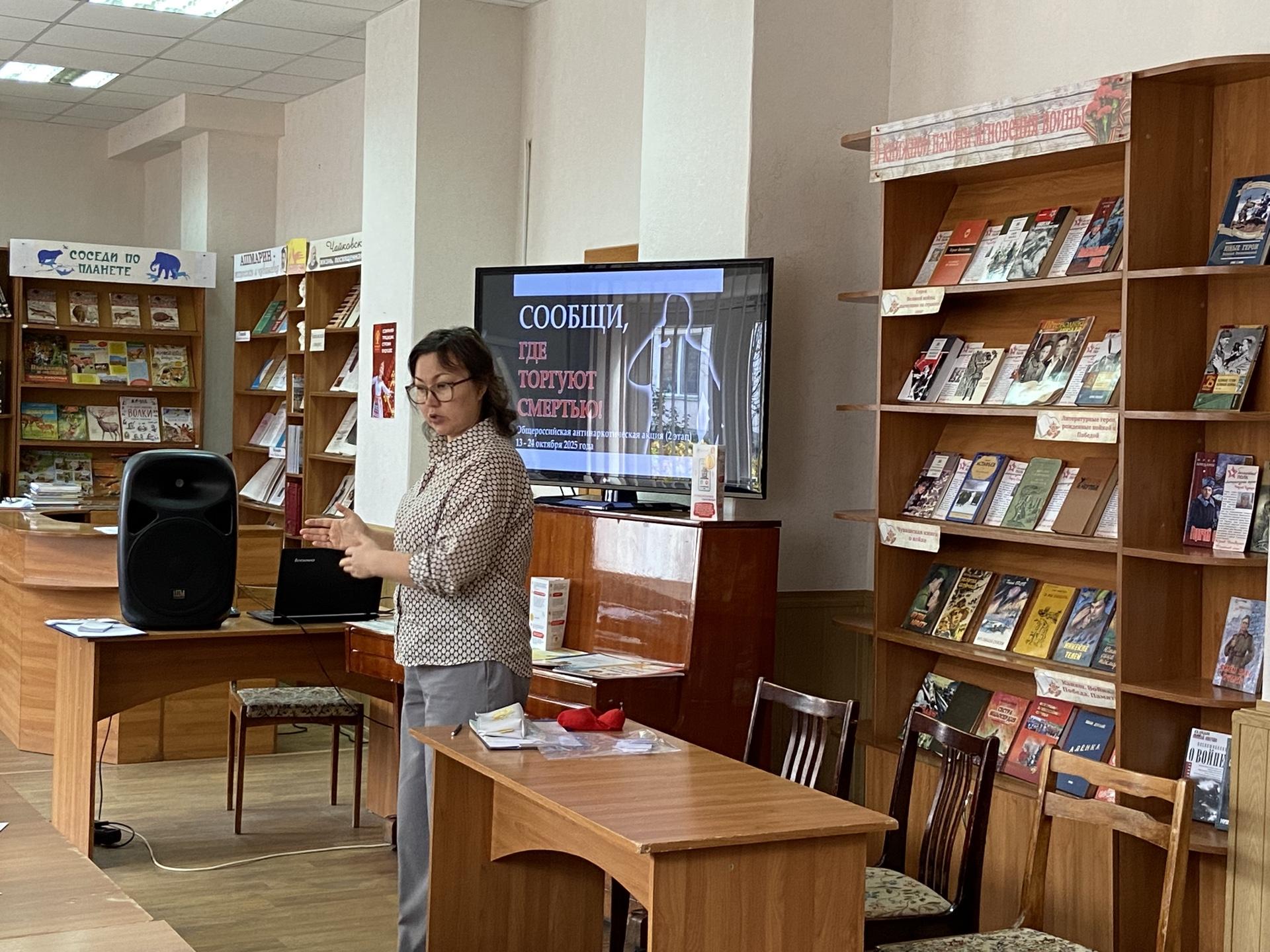 Библиотекарь Белкина Ю. А. рассказала об общероссийской акции «Сообщи, где торгуют смертью!», проходящей с целью привлечения внимания населения к этой острейшей проблеме, оказания помощи тем людям, которые попали в зависимость от наркотиков, также возможности каждого из нас проявить гражданскую позицию в борьбе с распространением этого заболевания. Эта акция подчеркивает значимость заботы о психическом здоровье и стремлении к здоровому образу жизни.