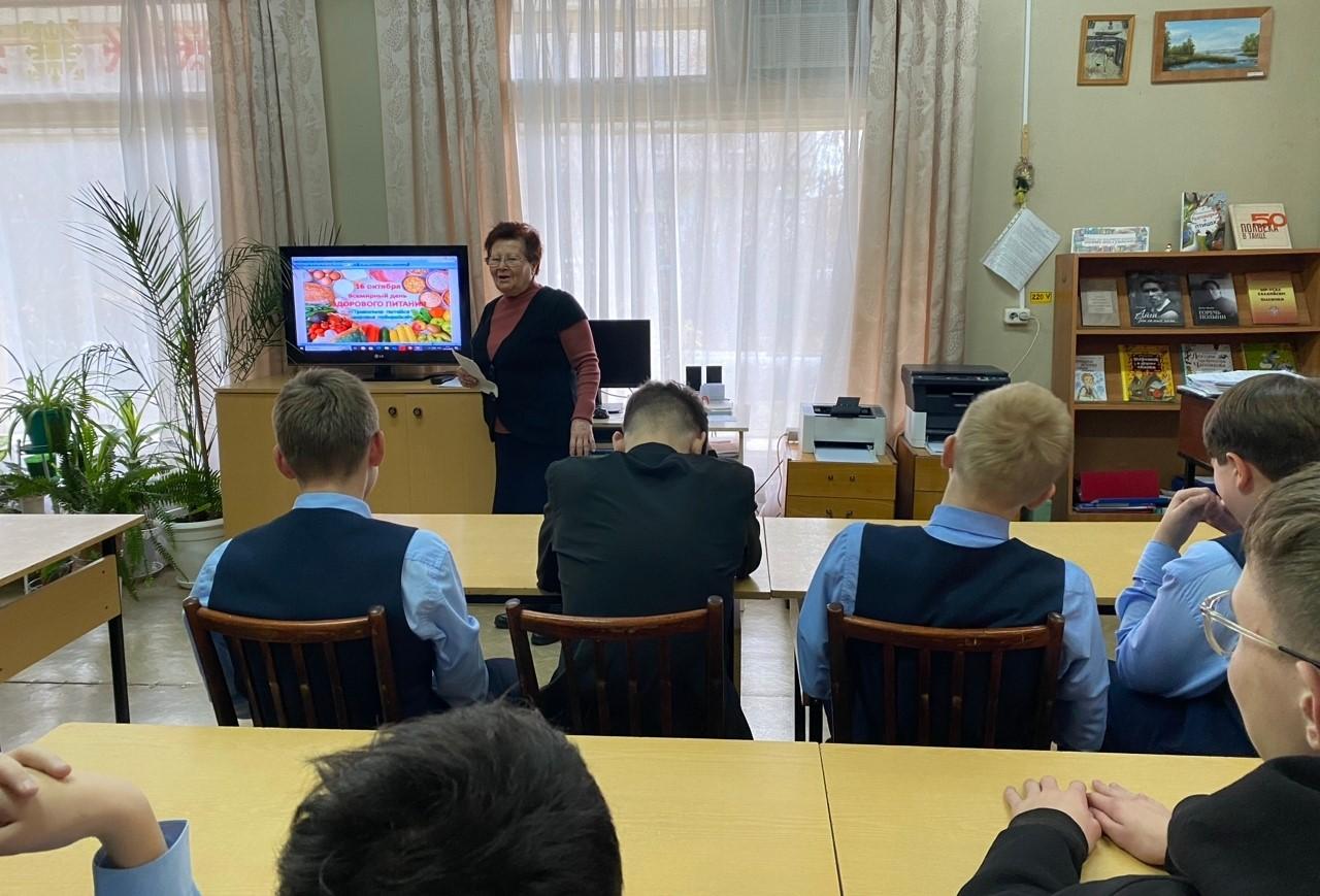 На встречу со школьниками была приглашена врач - педиатр Детской поликлиники БУ «Канашский ММЦ» Смирнова Галина Федотовна. В ходе беседы Галина Фёдотовна познакомила с основными правилами питания, рассказала об основных принципах здорового питания, о необходимых человеку питательных веществах и витаминах, о связанных с неправильным пищевым поведением заболеваниях, о правильном режиме приема пищи. Были даны рекомендации по рациону питания, продуктам и о воздействии их на организм человека. Врач подробно рассказала школьникам о таких болезнях, как сахарный диабет, ожирение, булимия, анорексия и. т. д., вызываемых нарушением приёма пищи. Мероприятие сопровождалось просмотром видеофильма «Урок здоровья». На встрече были обсуждены также и следующие вопросы: