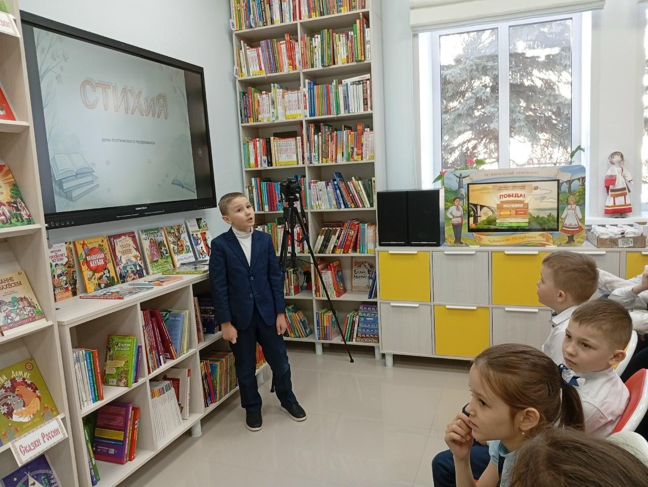 24 марта в детской библиотеке в рамках литературно-поэтического марафона «На сцене книга» состоялся день поэтического перформанса «СТИХиЯ». В этот день библиотека превратилась в площадку для творческого самовыражения, где поэзия оживала в живом исполнении. Ученики 2 «В» класса СОШ № 3 стали участниками театрализованного представления, где стихи являлись основой для художественного действия. С интересом просмотрели мастер-класс «Как читать стихи» от библиотекарей. Для выразительного чтения и театрализации детям были предложены известные стихотворения С. Маршака, С. Михалкова, Б. Заходера, А. Усачева и других любимых детских поэтов. Мальчики и девочки через движение, голос и сценические элементы «оживляли» стихи, создавая уникальное художественное пространство. Завершилось мероприятие награждением активных участников, викториной «Любимые строки любимых поэтов» и просмотром веселого мультфильма по стихотворению Генриха Сапгира «Принцесса и Людоед».