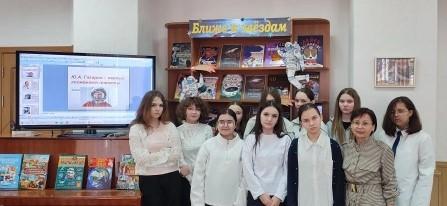 Библиотекарь Наталия Феклина рассказала семиклассникам средней школы № 8 о Юрии Гагарине - первом человеке, покорившим космос, о его детстве, любви к небу, о том, как ещё в юные годы он увлекся небом и как, преодолевая трудности, приближался к своей заветной мечте — отправиться в космическое путешествие.