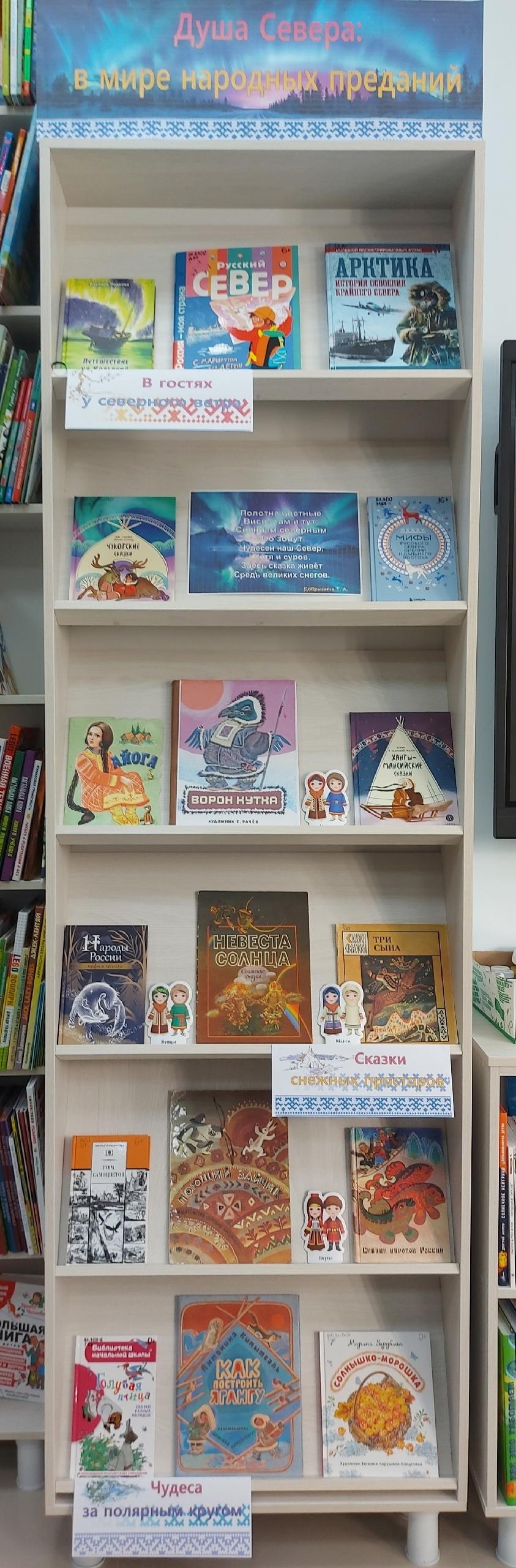 22 апреля в детской библиотеке в рамках фольклорного фестиваля «Сказания и легенды народов России» организована книжная выставка «Душа Севера: в мире народных преданий». Выставка знакомит с богатым фольклором коренных народов Севера от древних мифов до волшебных сказок, передаваемых из поколения в поколение. В разделе «Сказки снежных просторов» представлены сборники сказок и преданий народов Севера: ненцев, хантов, манси, эвенков, чукчей, эскимосов, якутов, селькупов. В этих сказках человек общается с духами природы, а животные наделены мудростью и речью. Раздел «Чудеса за полярным кругом» знакомит со сказками и стихами писателей Севера, навеянными народными сказаниями о силе, храбрости, смекалке, добре и справедливости. Дополняет выставку раздел «В гостях у северного ветра», который знакомит с книгами о русском Севере, о традициях, обрядах и образе жизни северных народов. Приглашаем читателей погрузиться в атмосферу древних преданий и открыть для себя Душу Севера через книгу.