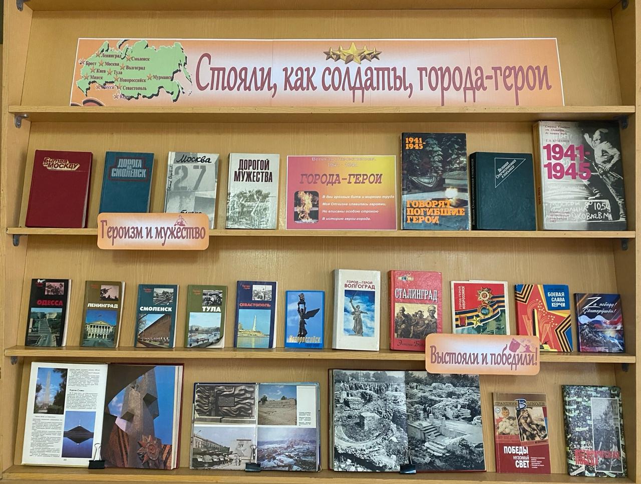 В читальном зале краеведческой библиотеки, в рамках исторического обозрения «Есть люди герои, а есть города!», оформлена книжная выставка-экскурс «Стояли, как солдаты, города-герои».