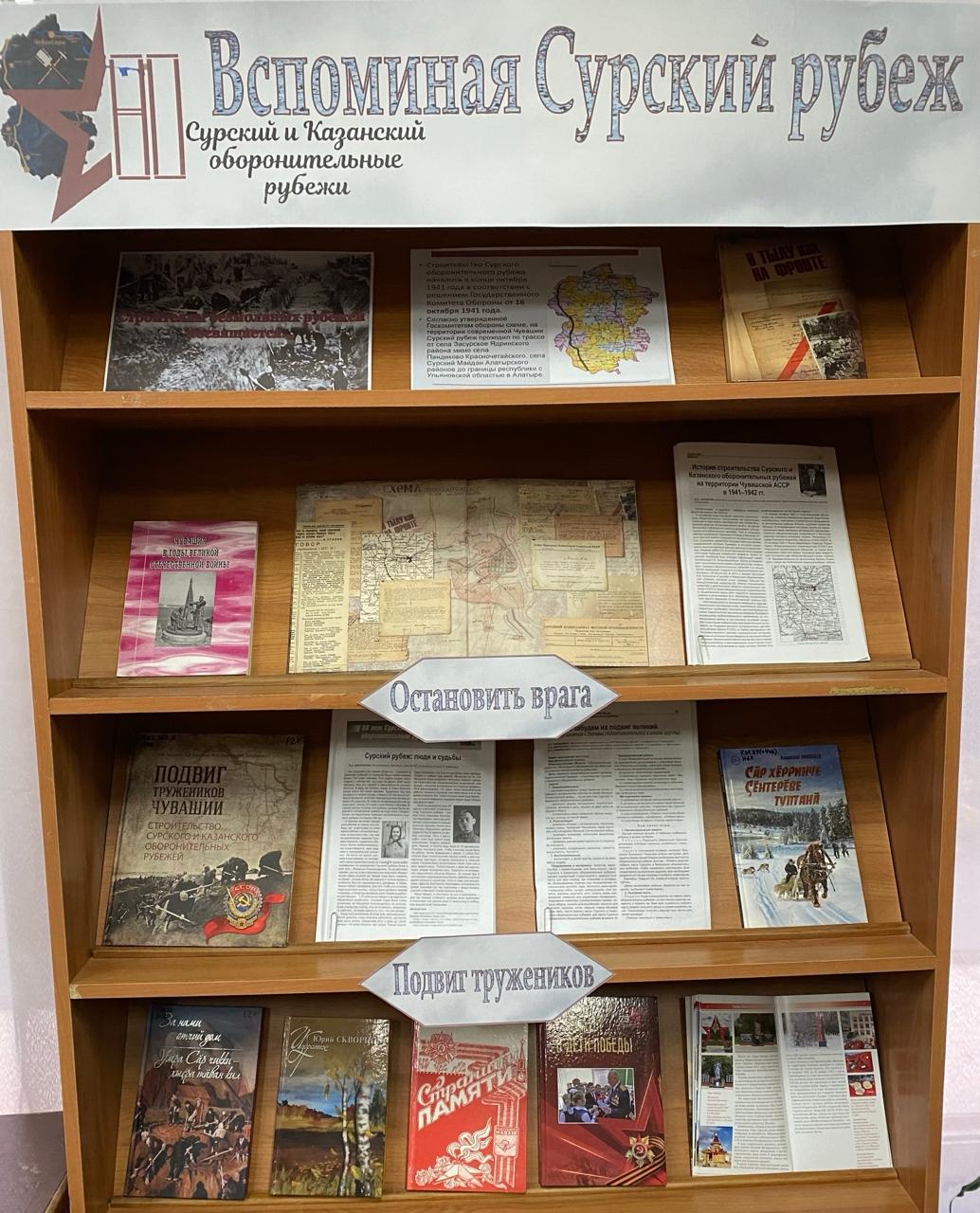 К этой знаменательной дате в краеведческой библиотеке оформлена книжная выставка-память «Вспоминая Сурский рубеж». Здесь представлены материалы о подвиге строителей Сурского рубежа. Центральное место на выставке занимает книга «Подвиг тружеников Чувашии: строительство Сурского и Казанского оборонительных рубежей». На основе архивных и опубликованных источников, воспоминаний участников строительства всесторонне раскрывается история массового трудового подвига населения республики. Книга иллюстрирована схемами, картами рубежей, воспроизведены фотографии из государственных и личных архивов.