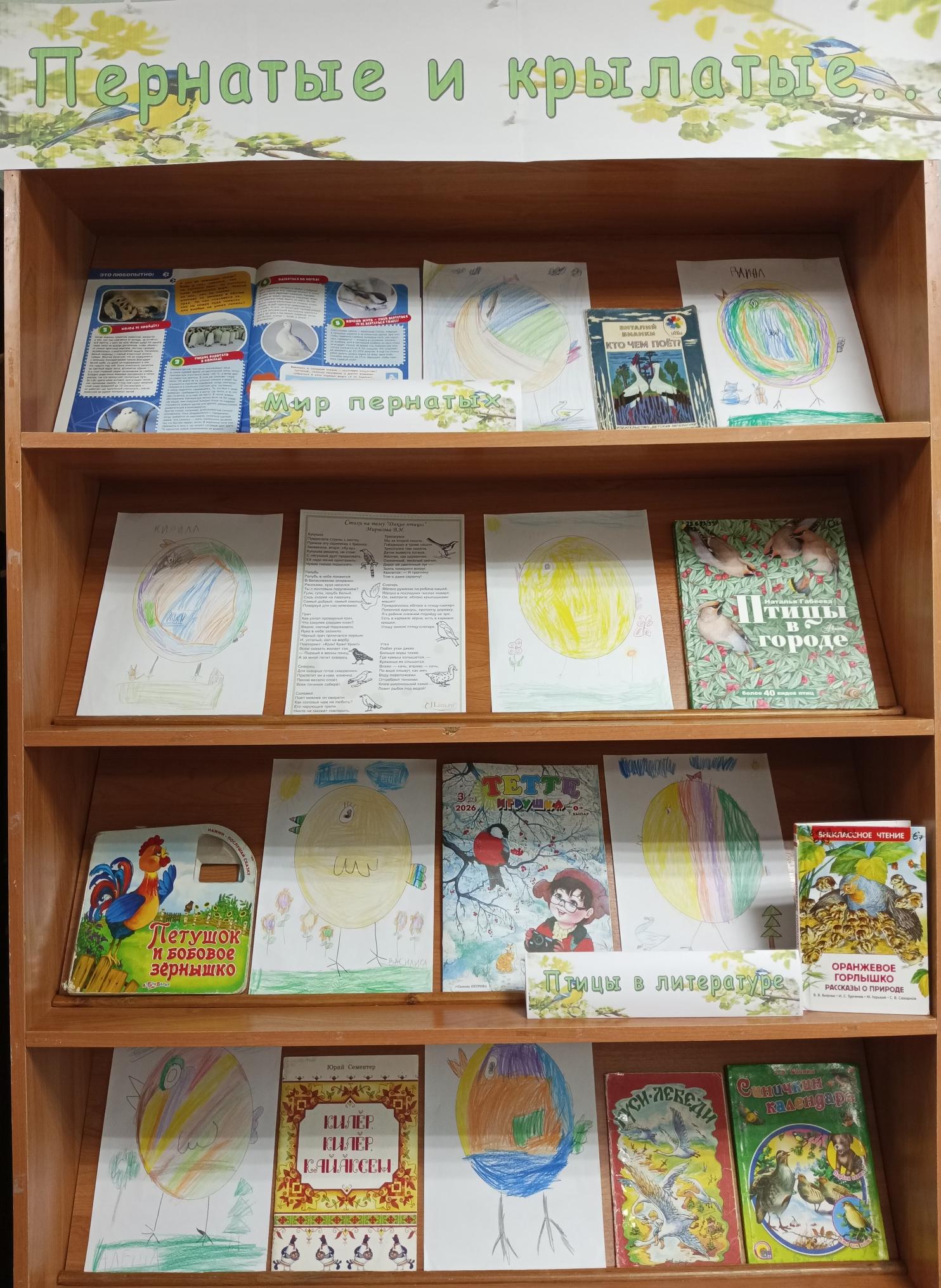 Вначале библиотекарь рассказала о птицах, провела обзор книги Н. Габеевой «Птицы в городе», продемонстрировала мультфильм «Серая шейка» и показала пошаговое рисование птички-невелички. Ребята с большим удовольствием принялись за работу: внимательно чертили линии, обводили круги и дорисовывали дополнительные предметы, как цветы, солнце, травку, деревья, бабочки и т.д. После усердной работы оформили выставку детских рисунков «Пернатые и крылатые».