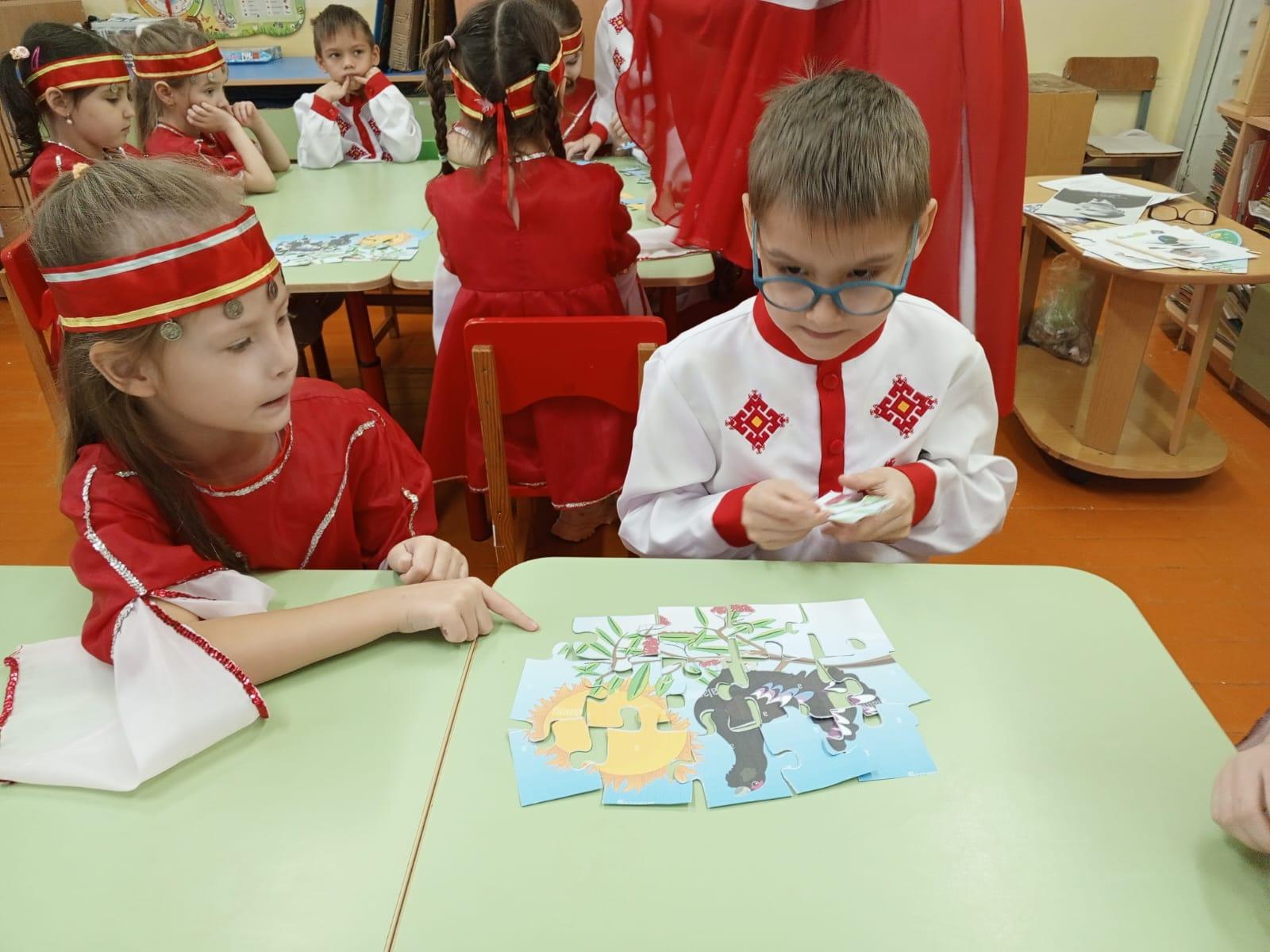 Читка началась с чувашской народной песни «Вăрмана кĕнĕ чух…» и игры-повторения «Кил-кил выляма…». Затем сунарçă Ҫтапан детишек-ребятишек пригласил в Ямашевский лес, чтобы вспомнить сказки чувашского писателя К. Чулгась про упа, тилĕ, мулкач, кашкăр, пăчăр, кăвакал, собрать пазлы, чтобы узнать новое чувашское слово, выполнить творческое задание, для закрепления изученного и составить небольшой диалог о себе. Отличным дополнением стал приход любимой бабушки Праски (серебряный волонтер библиотеки И.А. Антипова), которая в очередной раз приготовила для дошколят новую сказку про ăсан. В ходе чтения ребята отвечали на вопросы бабушки, играли по ролям, высказывали свои мнения о прочитанной сказке и используя чувашские слова пересказали сказку Кузьмы Чулгась «Ямаш вăрманĕнчи ăсансене пурне те хам хыçран ертсе килтĕм» - «Как я привел домой всех тетеревов из Ямашского леса».