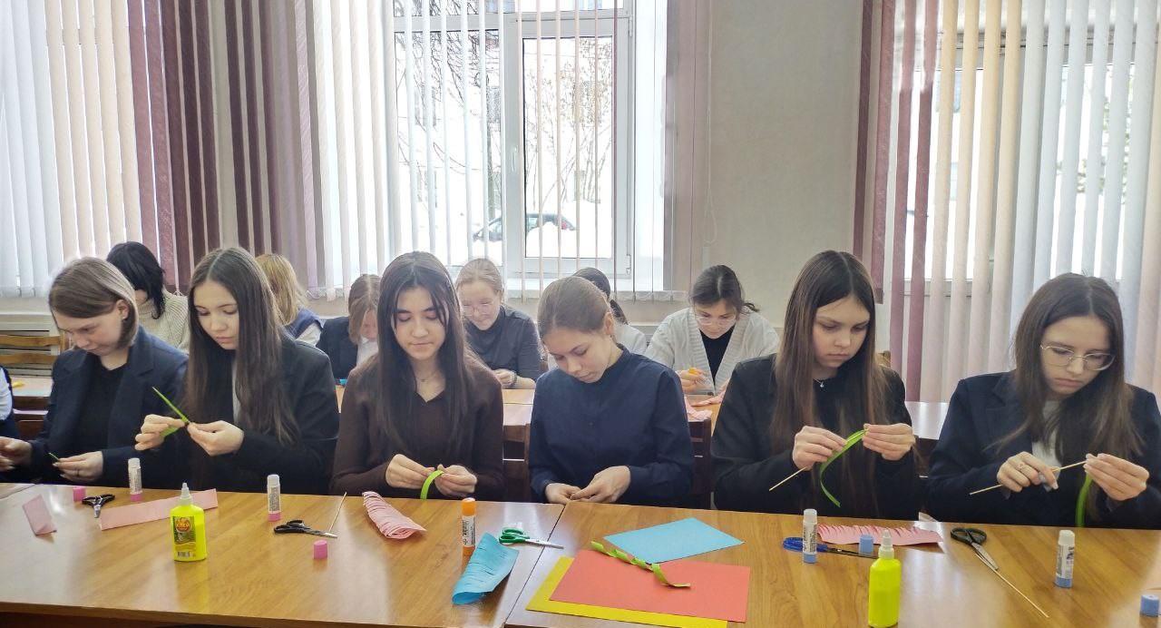 Педагог Дома детского творчества С.С. Спиридонова ознакомила учащихся 7 класса СОШ № 8 с материалами и приспособлениями для работы, разъяснила пошаговую инструкцию по технике изготовления бумажных цветов.
