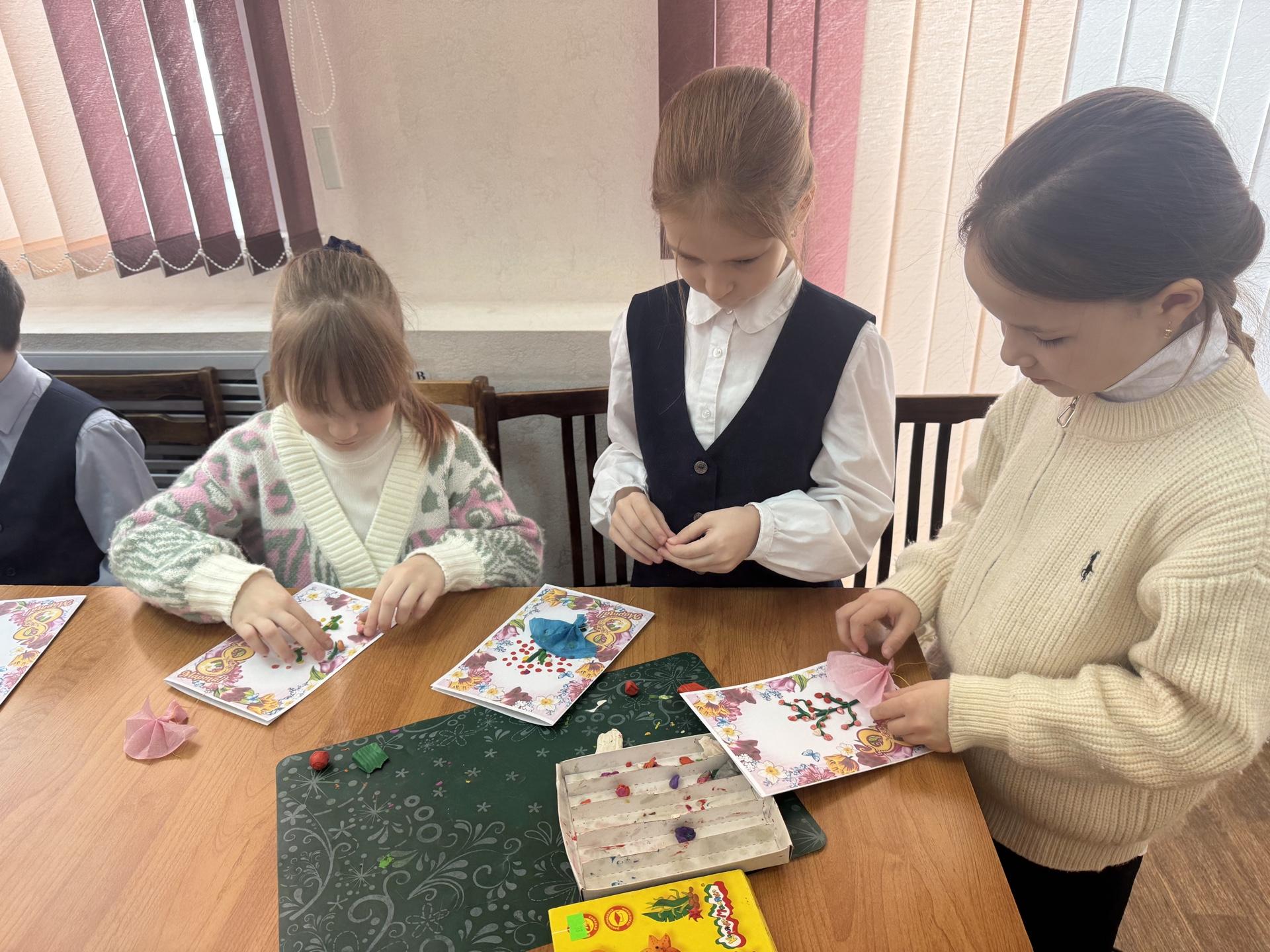 Ребята из 1 «б» класса СОШ №10 с радостью смастерили открытки в технике «Пластилинография», а также узнали об истории праздника, вспомнили стихи и книги о девочках и мамах. В итоге мальчишки и девчонки изготовили яркие открытки с весенними веточками мимозы, которые стали символом нежности и весеннего пробуждения. Во время работы школьники делились историями о своих мамах и бабушках, рассказывали о том, как они вдохновляют их на достижения и помогают в трудные моменты. В конце занятия участники арт - мастерской решили, что эти открытки они обязательно подарят своим мамам и бабушкам, чтобы сделать их день еще более радостным и запоминающимся.